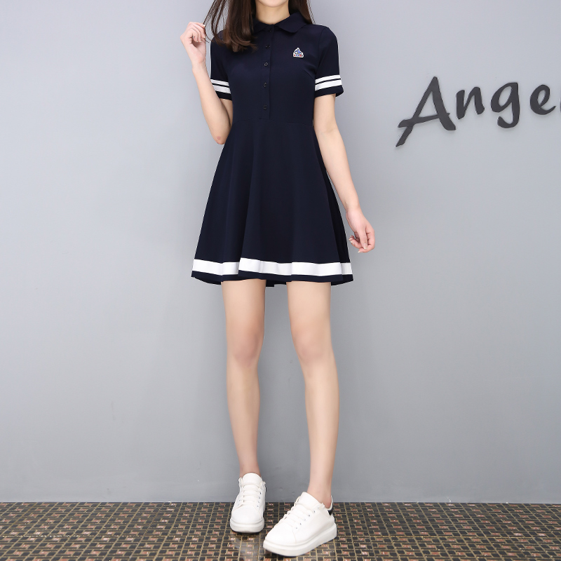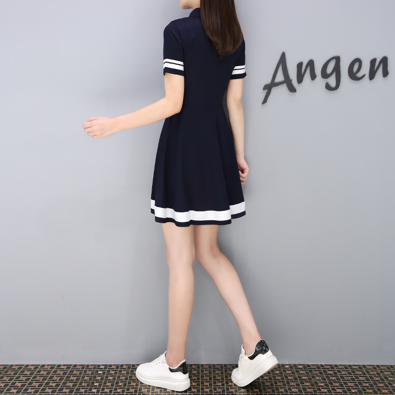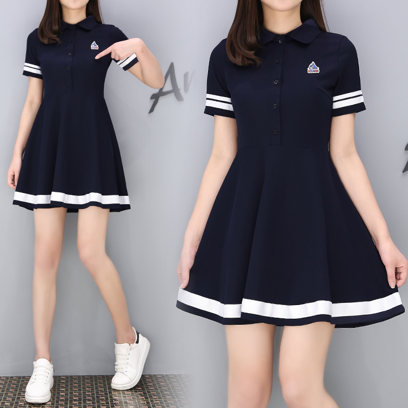 夏季連衣裙女新款韓版顯瘦修身高腰學生翻領a字中長款裙子