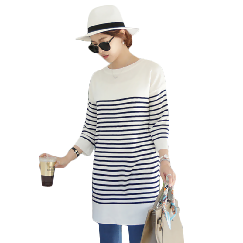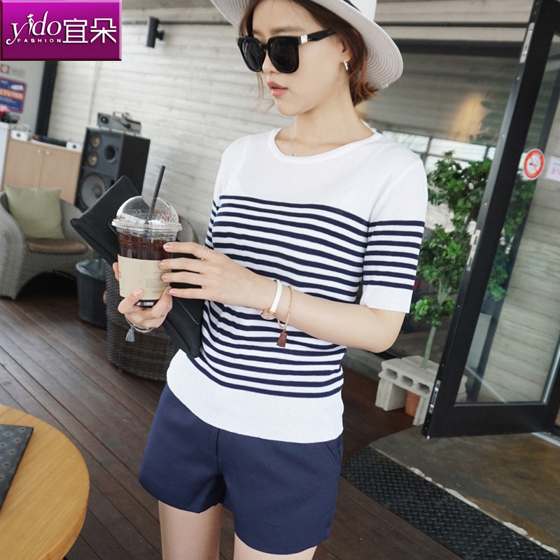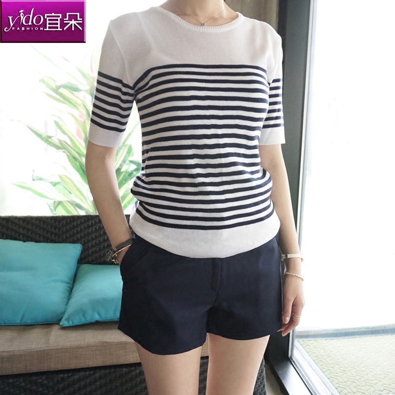 中長款短袖針織衫女春夏新款中袖條紋T恤針織衫套頭針織T恤女薄款