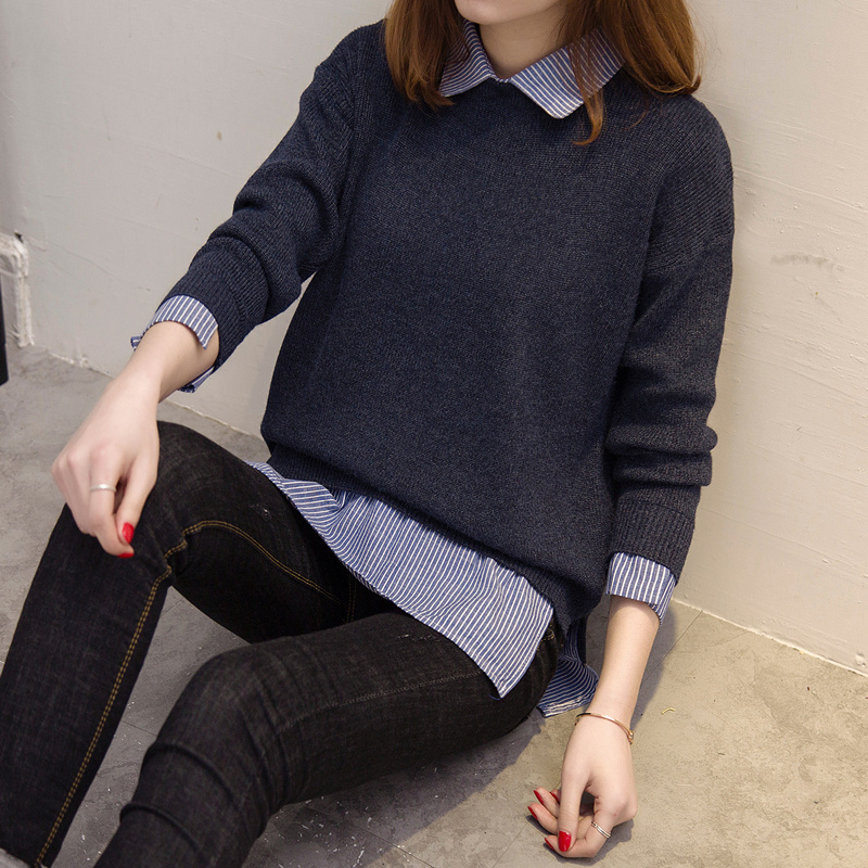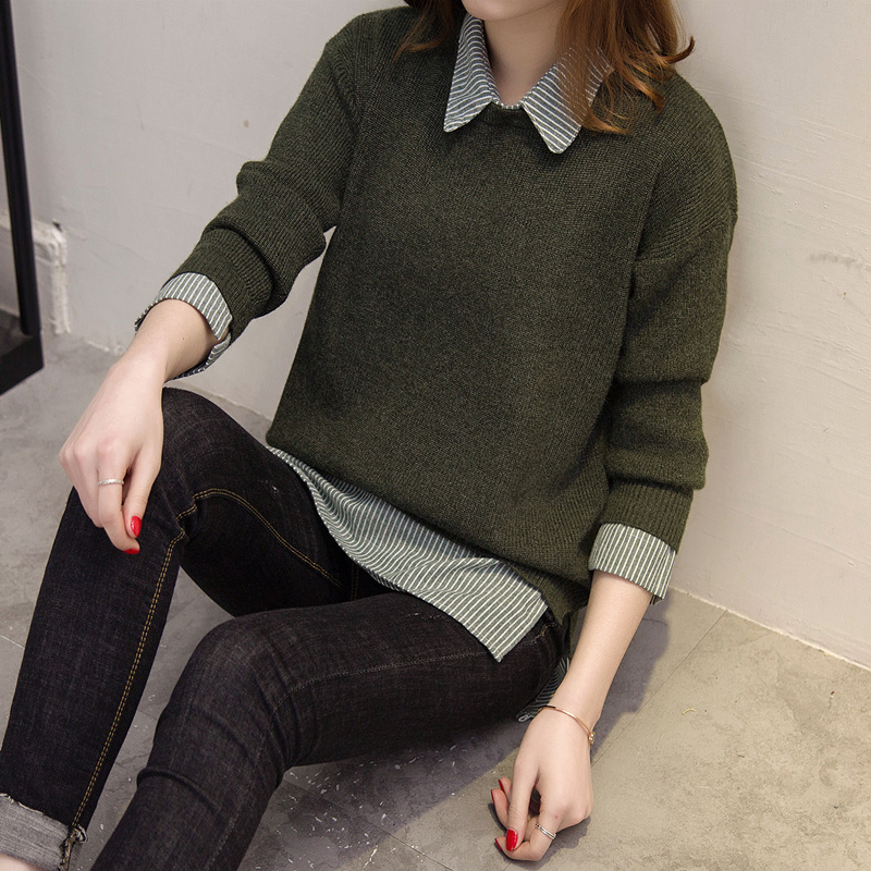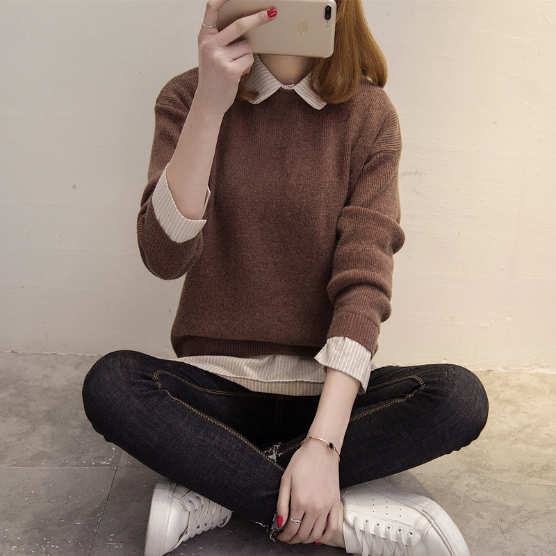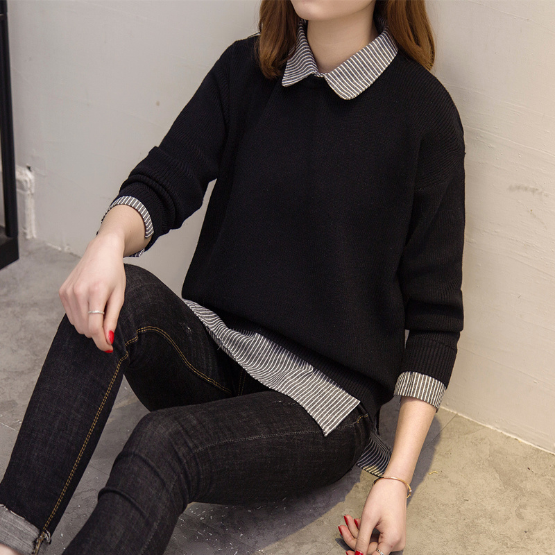 毛衣女秋冬韓版套頭寬松娃娃領假倆件針織衫加厚純色毛衣打底外套