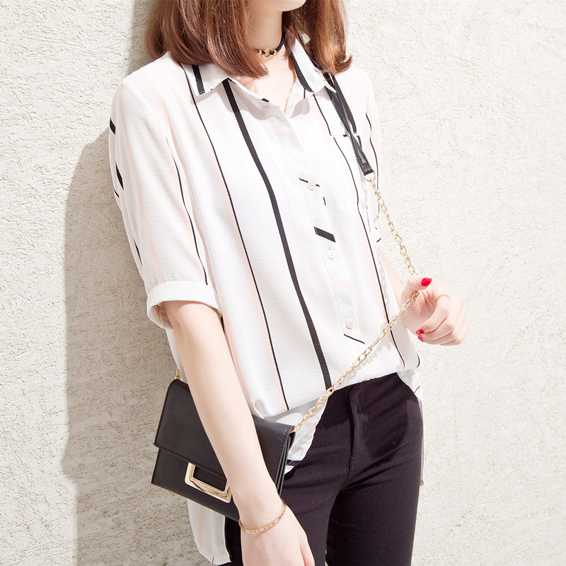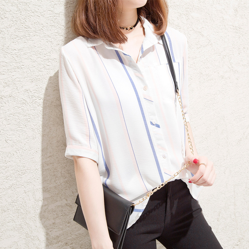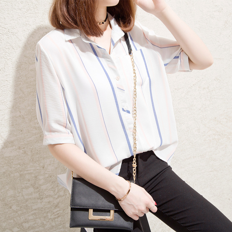 條紋白襯衫女甜美上衣小清新港味雪紡襯衣半袖韓范女夏裝新款