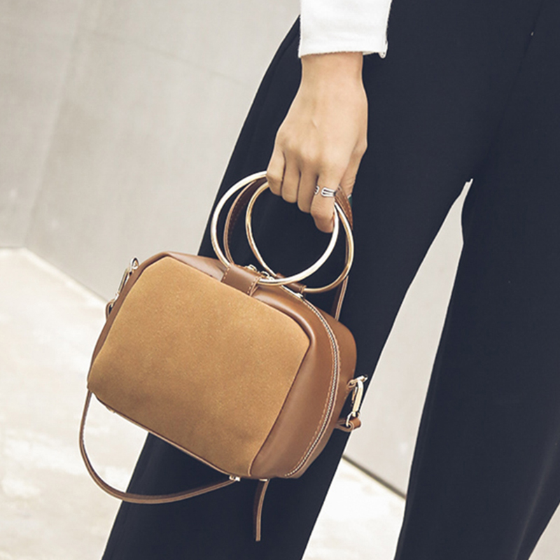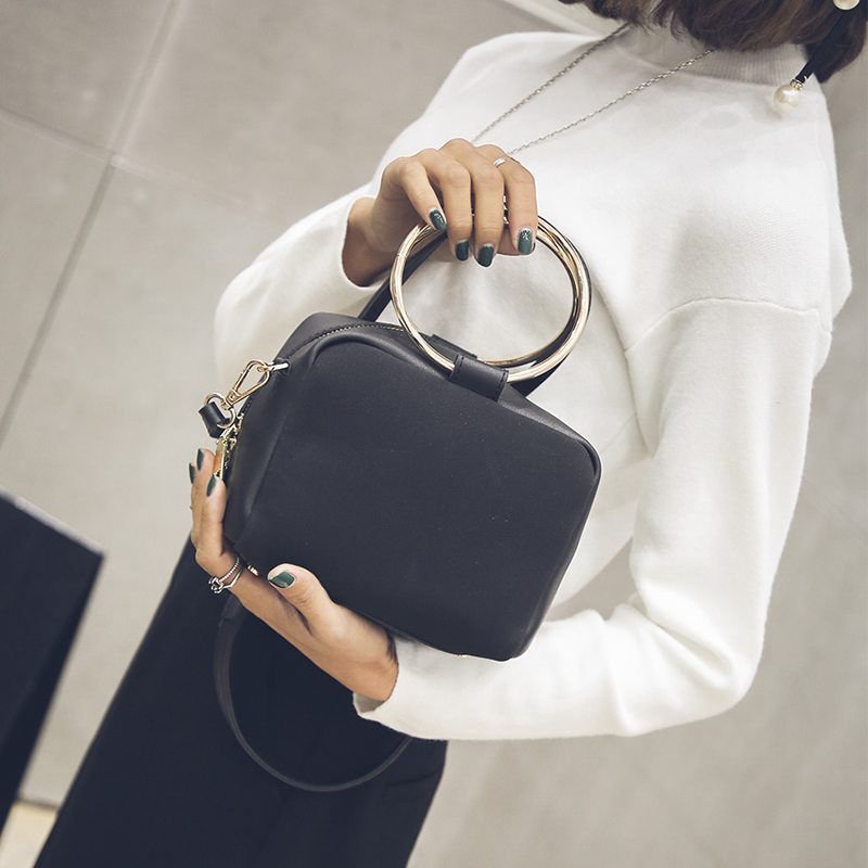秋冬新款韓版磨砂撞色單肩女包迷你小方包圓環手提包斜挎小包