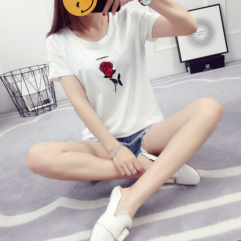 玫瑰刺繡t恤女短袖破洞半袖韓范夏裝新款韓版潮寬松百搭學生