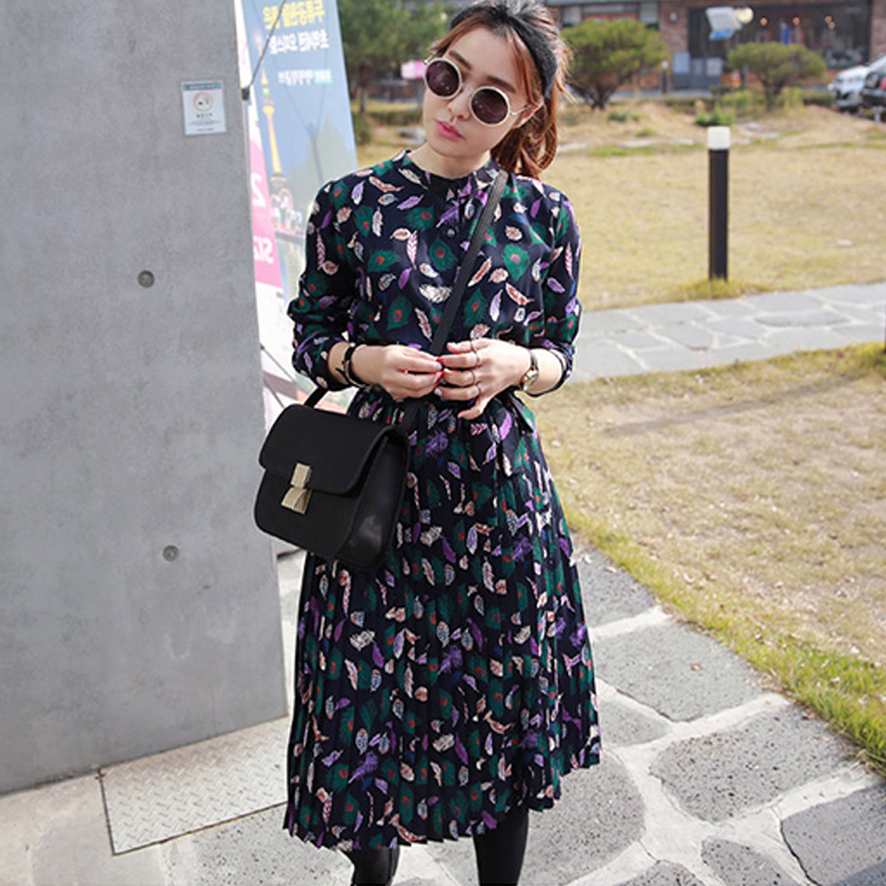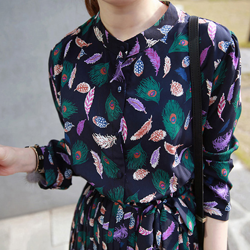 春秋韓版新款女裝襯衫打底連衣裙褶皺開衫裙碎花長袖雪紡裙