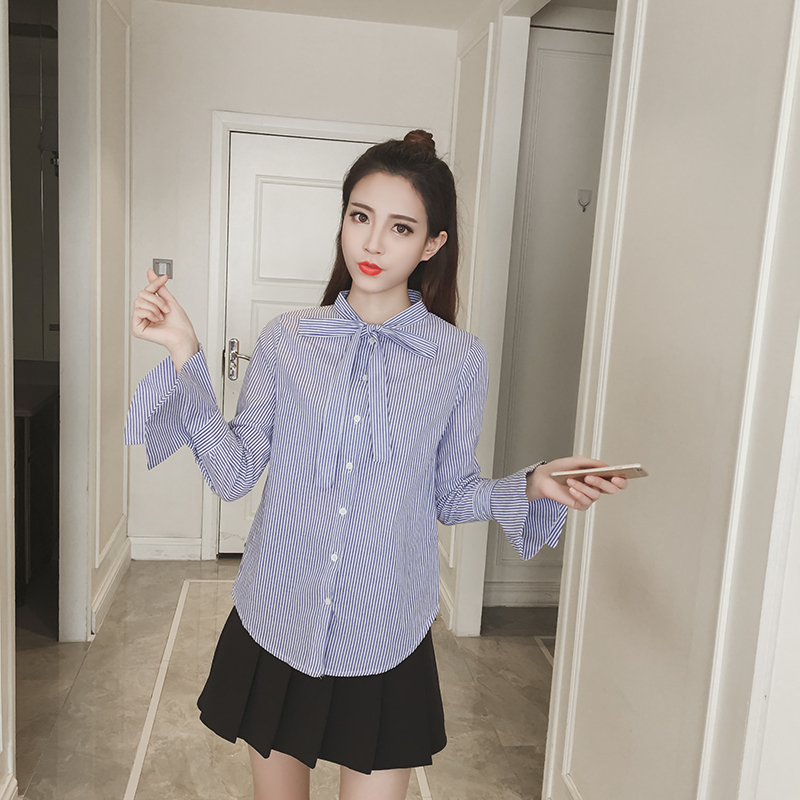 春新款女裝韓版蝴蝶結條紋襯衫女長袖雪紡襯衣喇叭袖百搭上衣