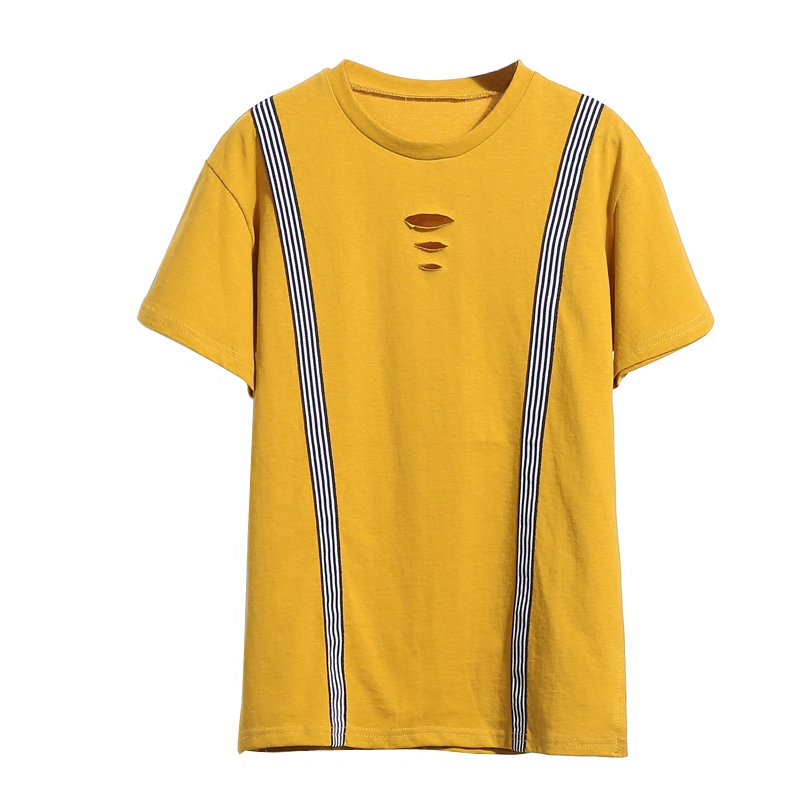 夏季韓版寬松純色短袖T恤新款拼接條紋套頭百搭大碼女裝體恤