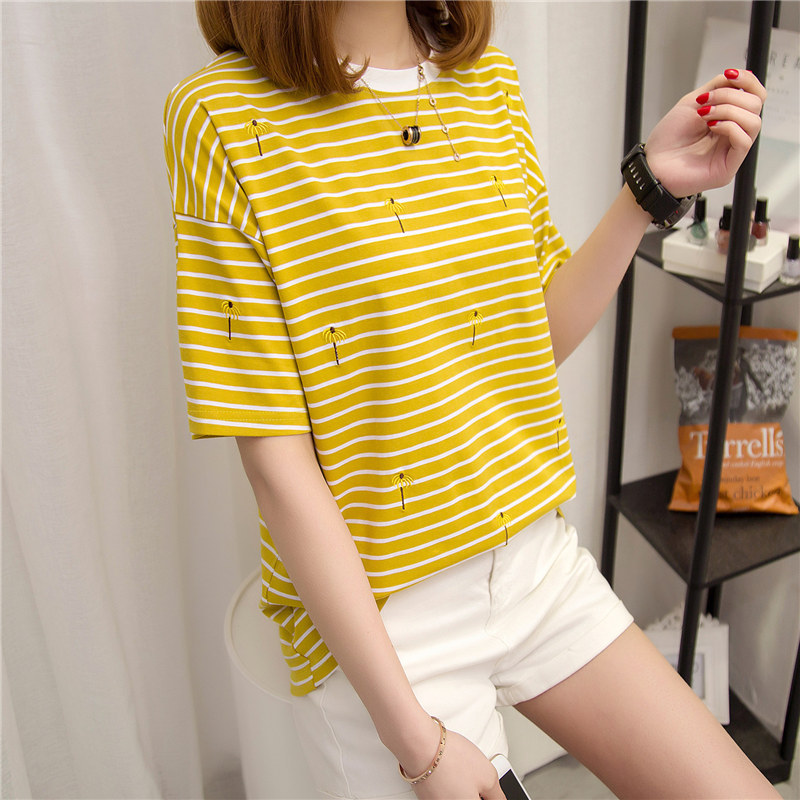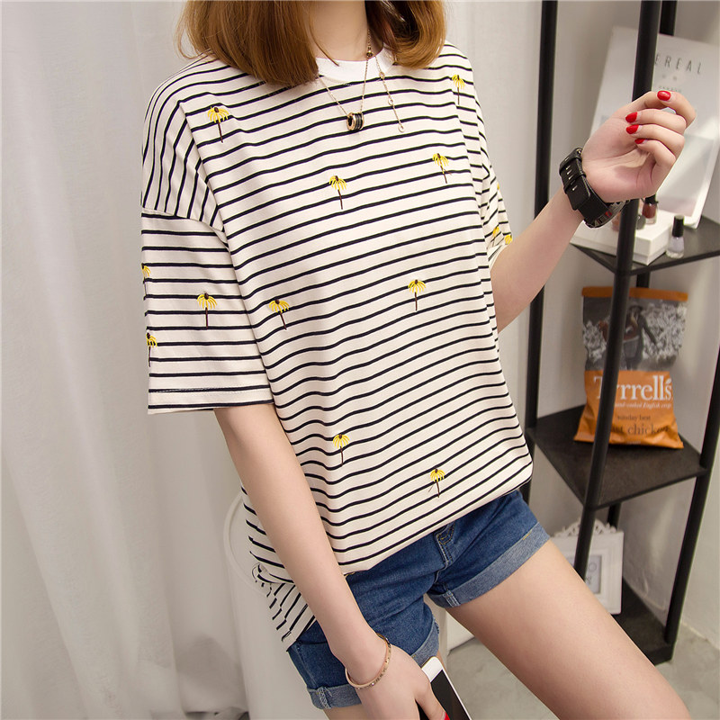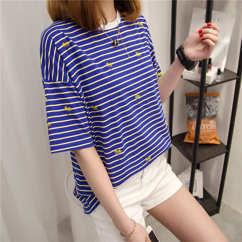 夏裝新款女裝條紋寬松t恤女中長袖韓版學生上衣女打底體恤衫