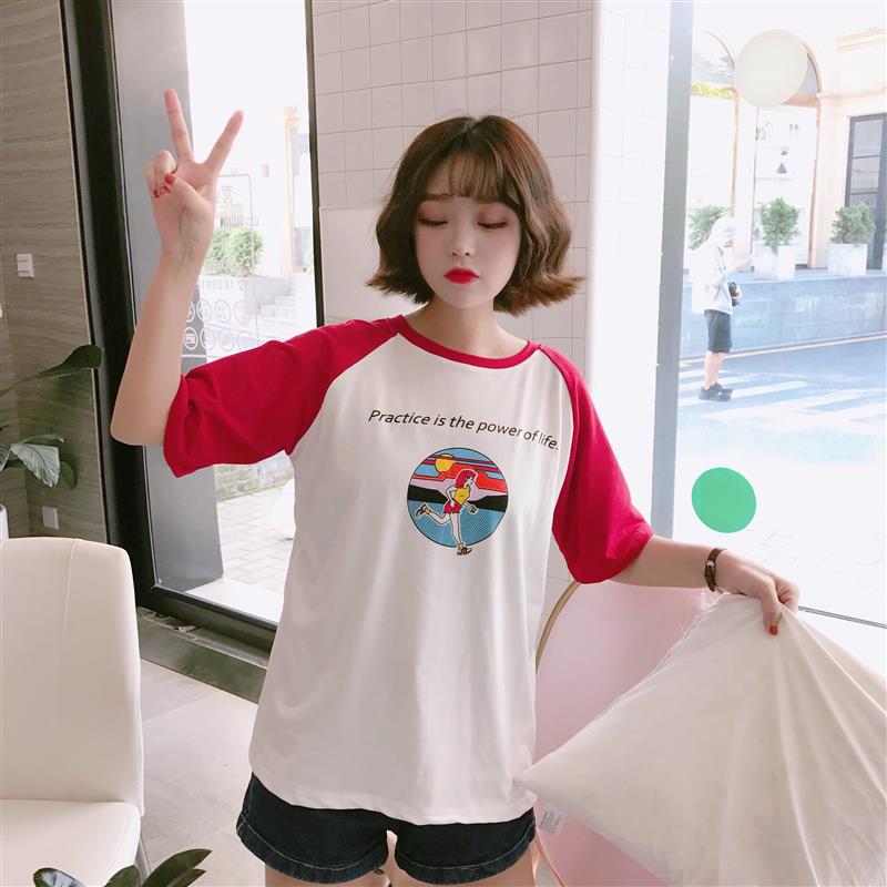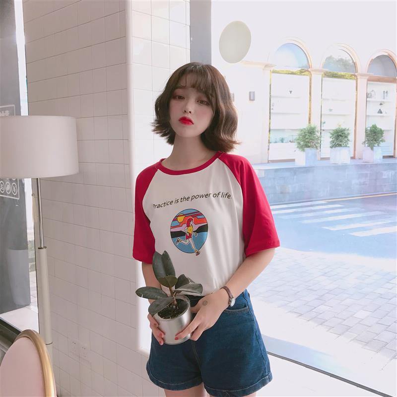 夏裝女裝韓版學院風拼色字母寬松短袖T恤百搭學生插肩袖中袖上衣