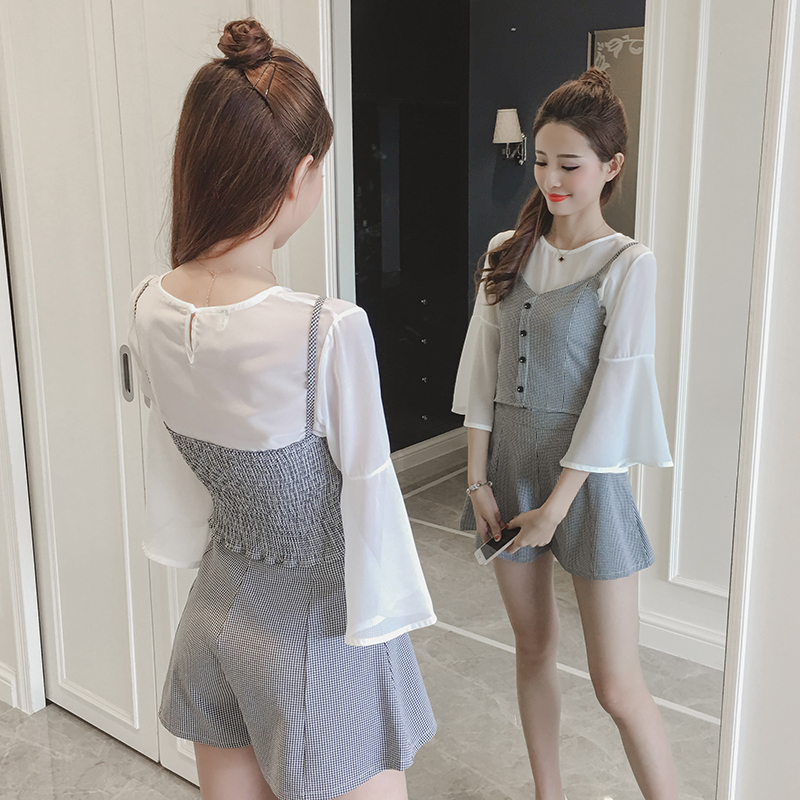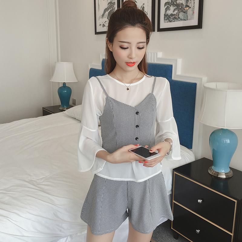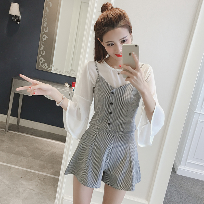 夏季新款女裝韓版荷葉袖雪紡衫+格子吊帶馬甲短褲三件套裝潮