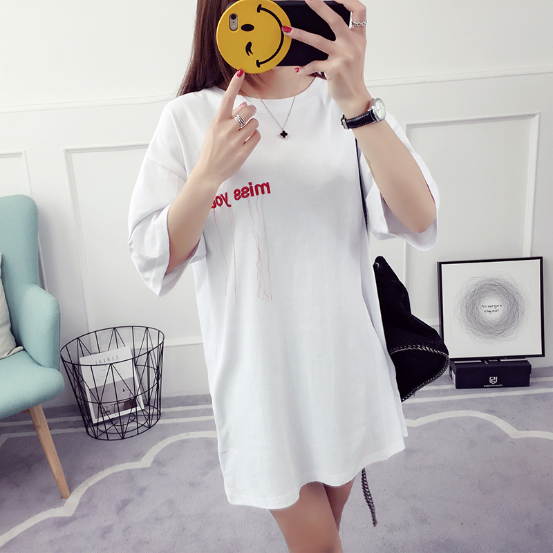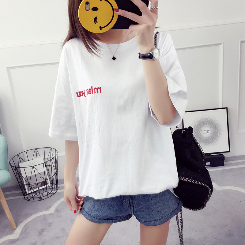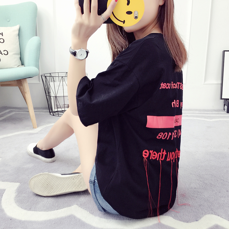 刺繡字母t恤夏季短袖女韓版潮寬松百搭學生中長款流蘇上衣打底衫