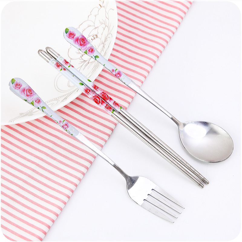 可愛創意禮品不銹鋼筷子盒叉子勺子套裝便攜式餐具花色復古三件套