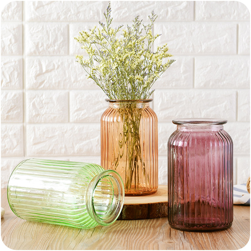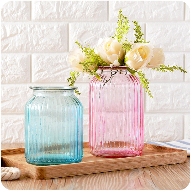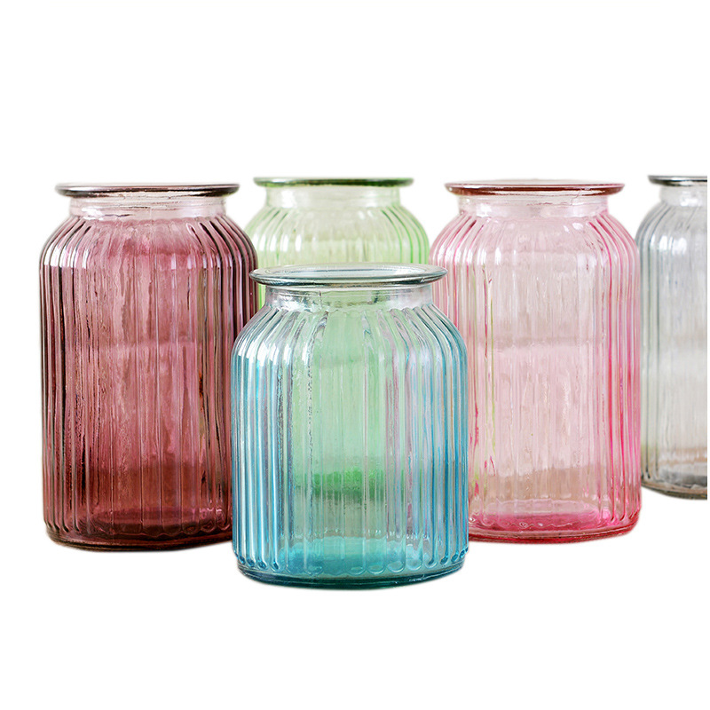 歐式彩色玻璃干花瓶家居簡約風擺件客廳創意透明鮮花瓶定制豎紋厚