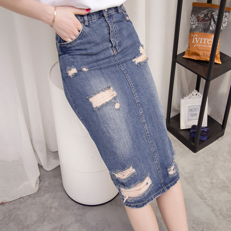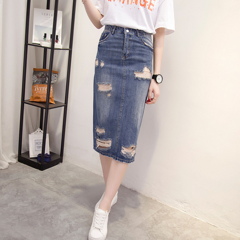 女裝夏裝新款潮破洞牛仔裙子女春中長款直筒寬松韓版低腰百搭