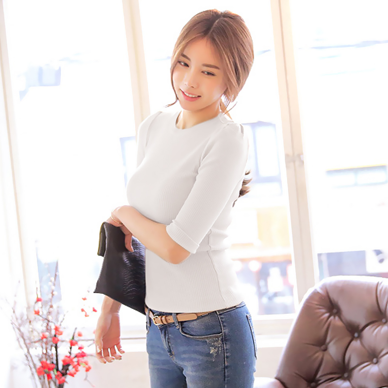 中袖圓領短款針織衫女 秋季套頭打底針織衫毛衣女顯瘦毛衣女外套