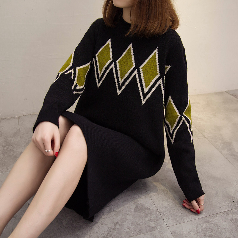 套頭圓領毛衣女秋冬拼色菱形格打底衫中長款寬松毛衣裙加厚外套女