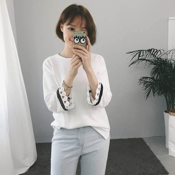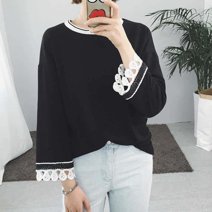 秋裝新款韓版百搭休閑寬松撞色領口拼接花邊袖上衣T恤女裝