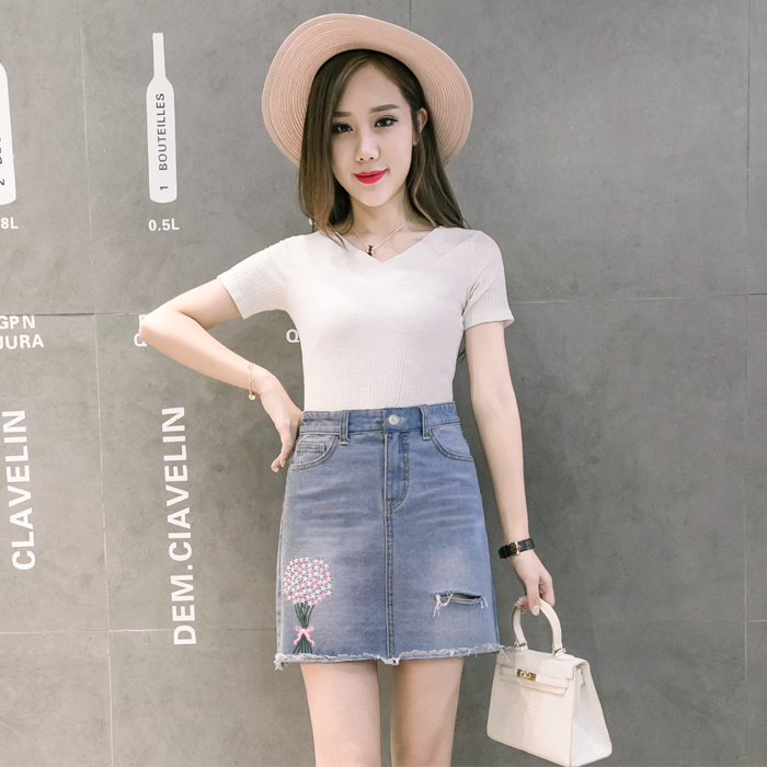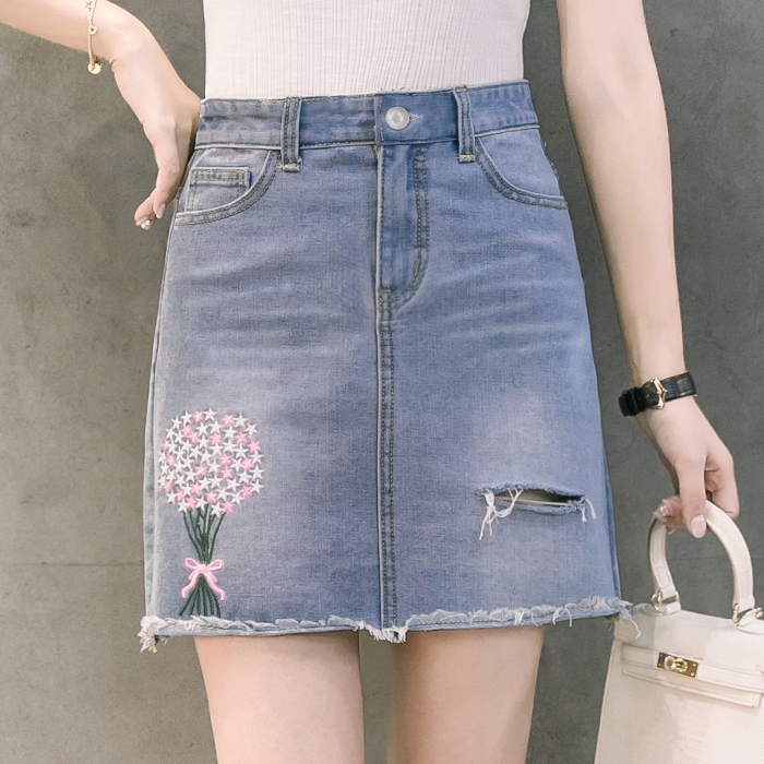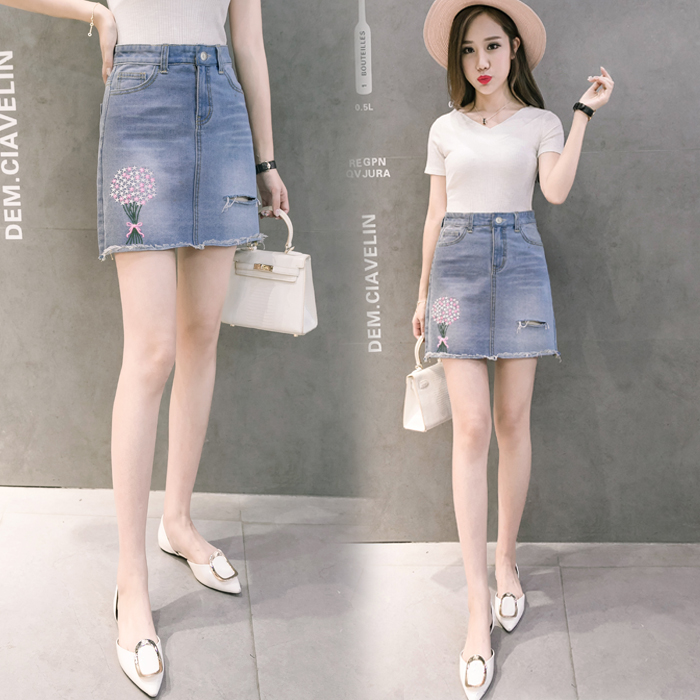韓版高腰繡花牛仔裙半身裙女破洞短裙A字裙包臀毛邊半裙夏季