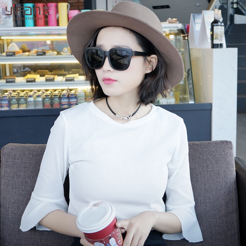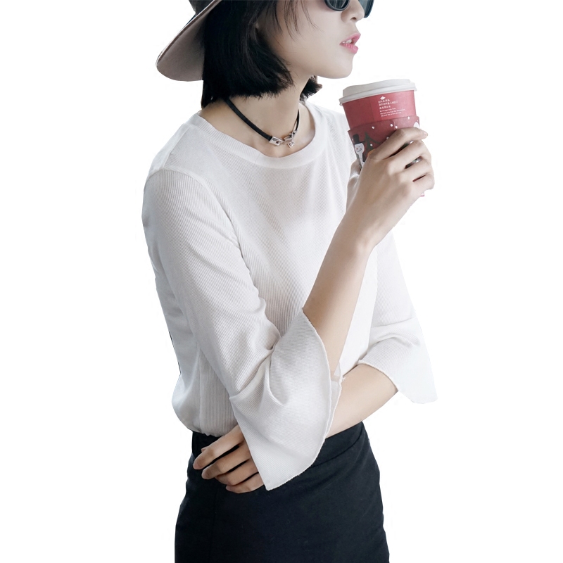 春夏季七分袖女T恤喇叭袖上衣修身套頭白色圓領打底衫韓版荷葉邊