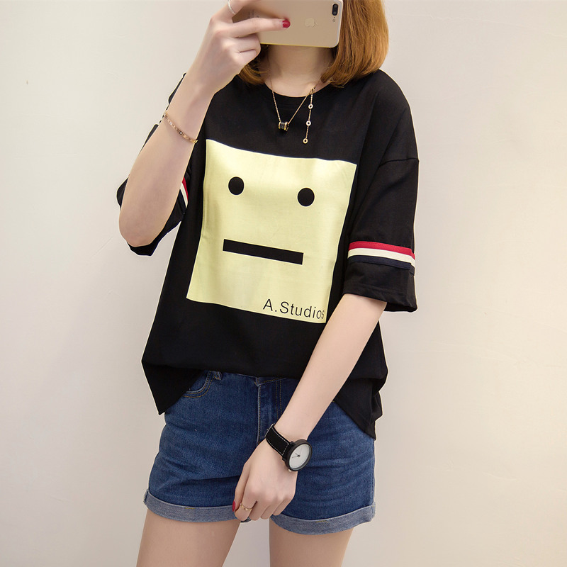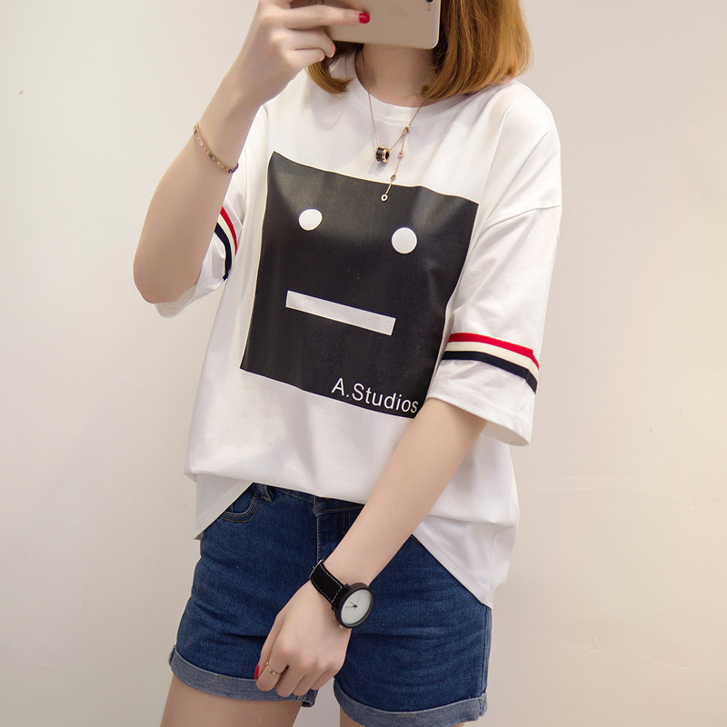 夏裝新款女裝條紋t恤女短袖韓版卡通寬松打底體恤衫百搭上衣