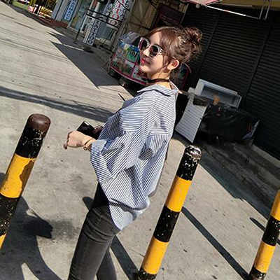 襯衫女長袖2017春裝新款夏韓版寬松藍色中長款藍白豎條紋襯衣外套