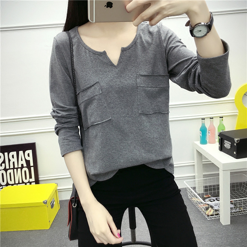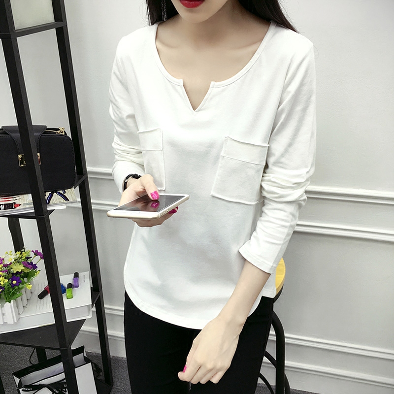 秋裝新款純色棉長袖T恤女打底衫V領寬松大碼顯瘦打底衫女潮