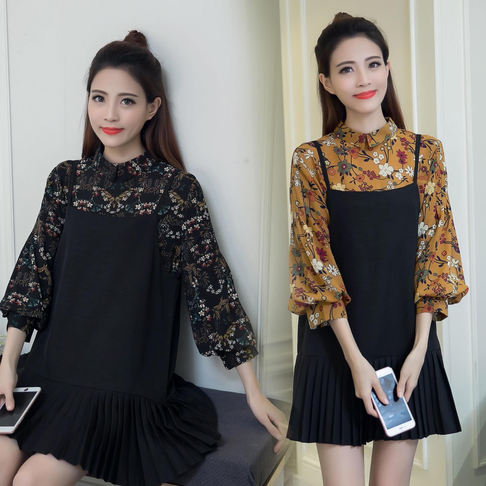 春秋裝新款女裝復古印花兩件套顯瘦百褶中長款吊帶碎花連衣裙