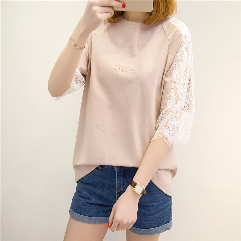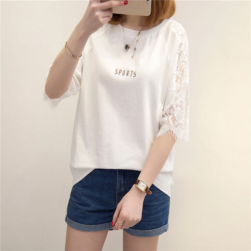 夏裝新款女上衣白色蕾絲t恤女中長袖鏤空打底體恤女短袖百搭