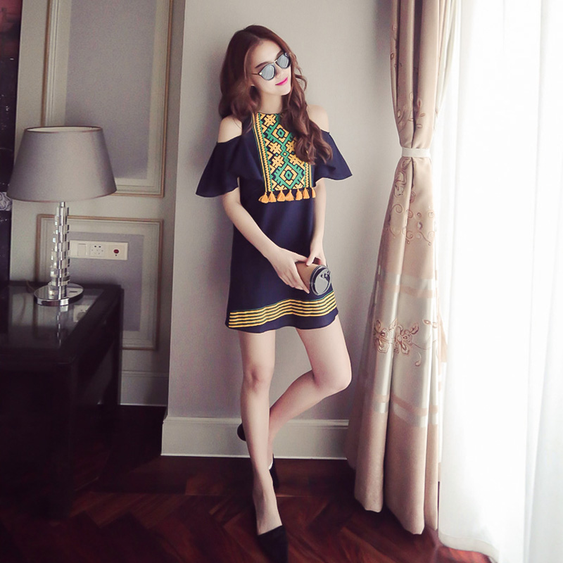 夏季韓版棉麻露肩連衣裙顯瘦時尚印花荷葉袖短裙海邊度假裙沙灘裙