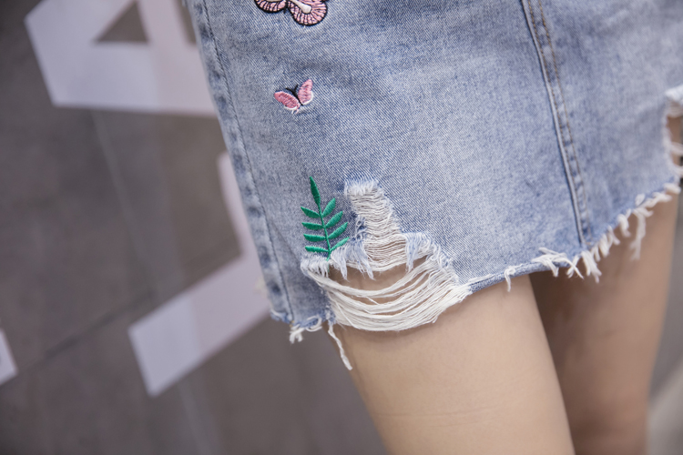 韓版高腰破洞牛仔裙半身裙女夏季包臀短裙A字裙刺繡半裙繡花女裙