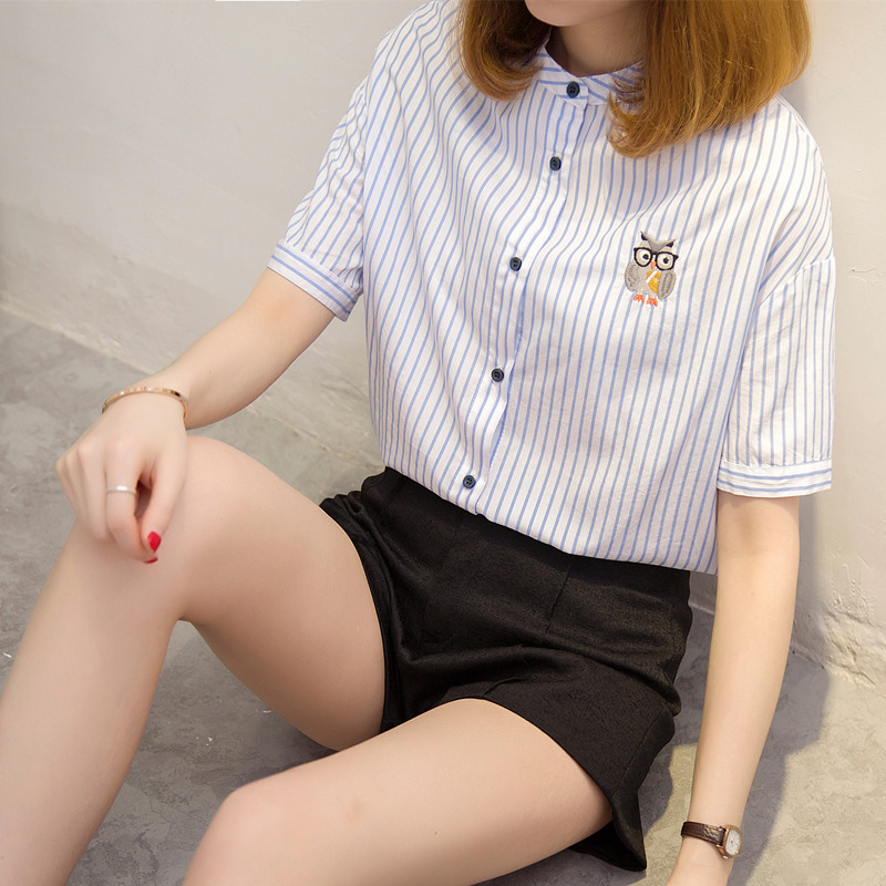 條紋襯衫女長袖小清新上衣女夏寬松半袖韓版bf風襯衣女百搭學生
