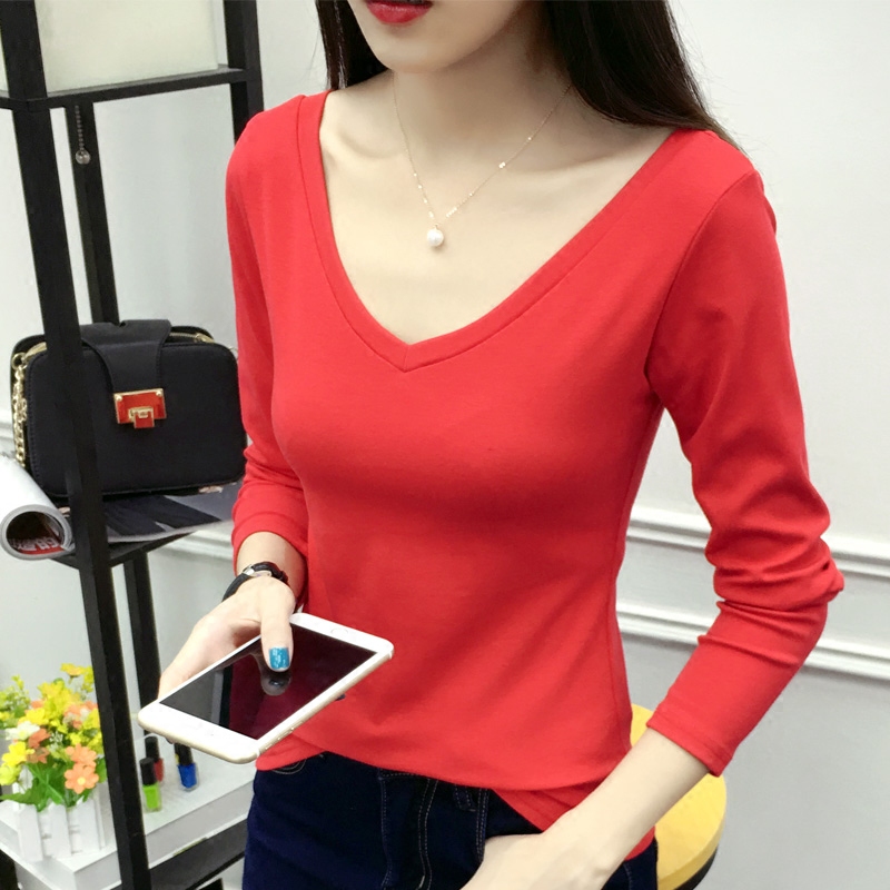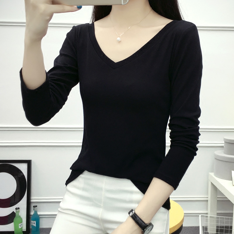 秋裝棉v領百搭長袖T恤女打底衫外穿大碼顯瘦女裝上衣潮