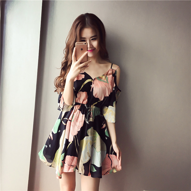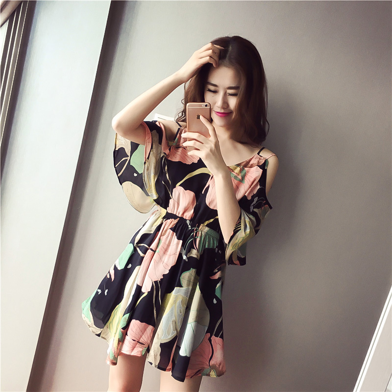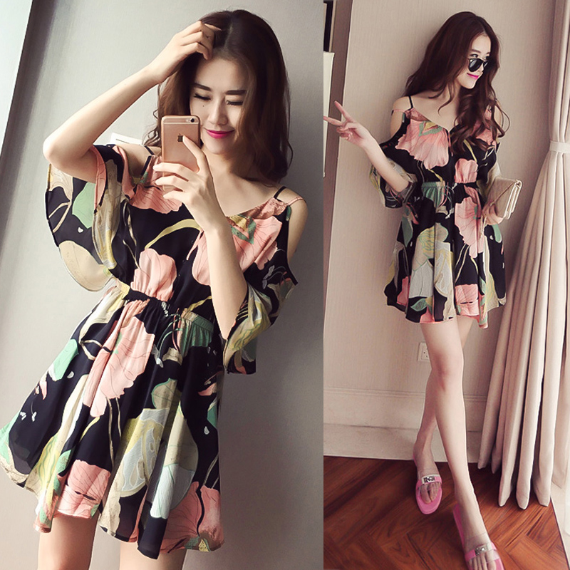 春夏季半袖T恤連衣裙女韓版雪紡印花上衣服短袖中長款露肩打底衫