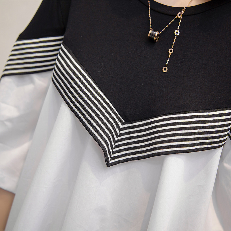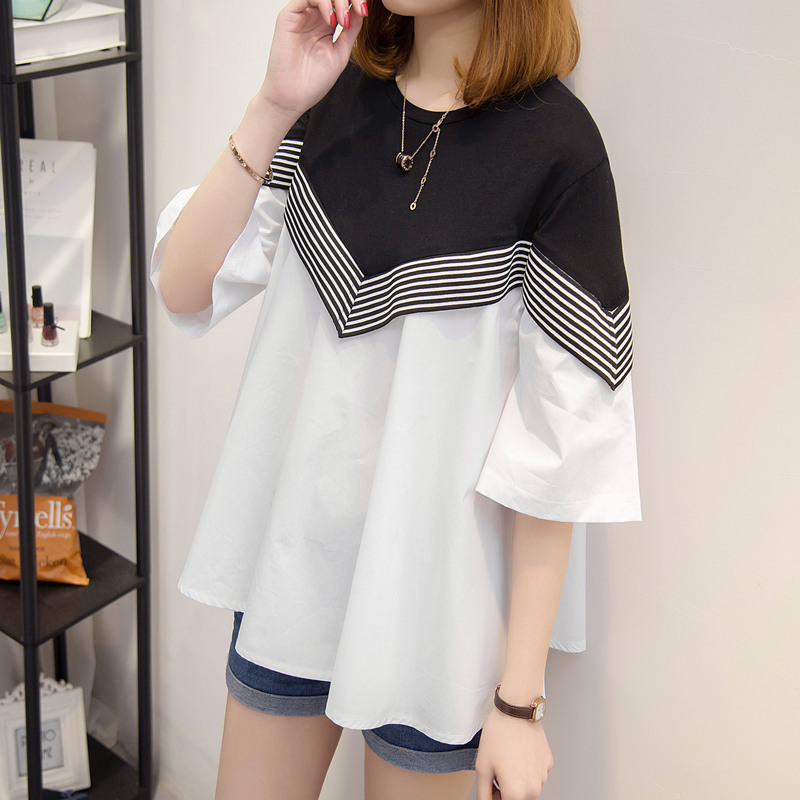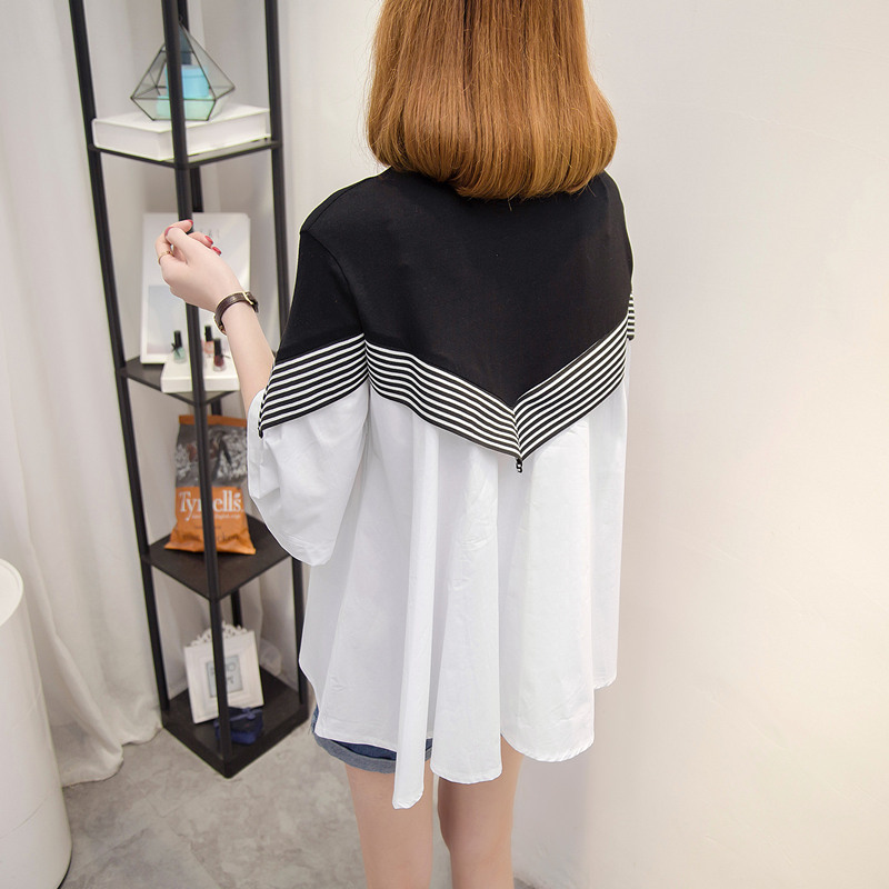 夏季衣服女裝韓版寬松拼接打底體恤衫新款春裝百搭中長袖上衣
