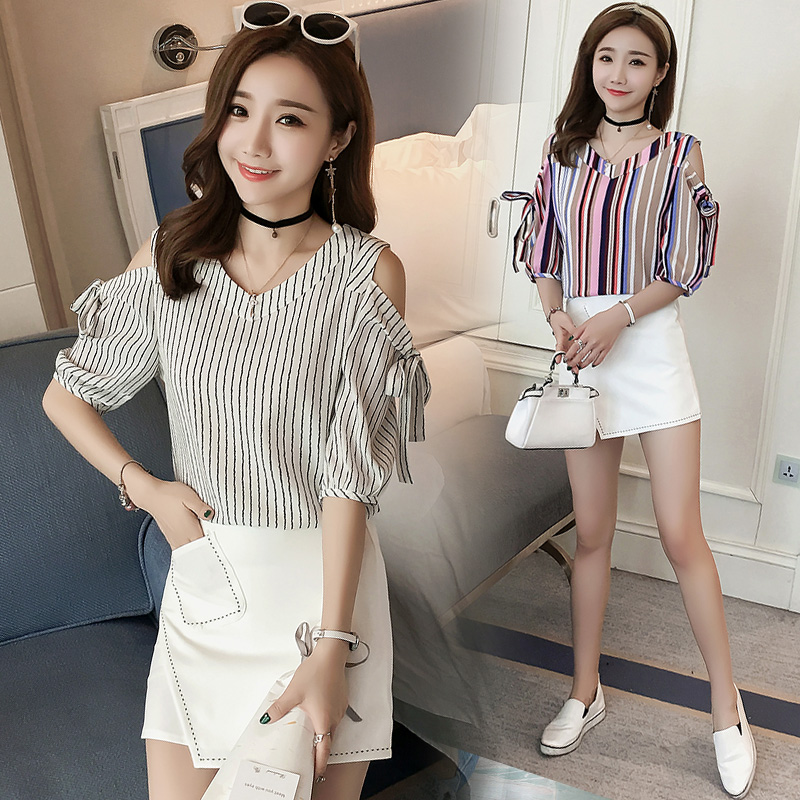 夏季新款女裝韓版條紋露肩雪紡衫套裝女休閑高腰半身短裙兩件套潮
