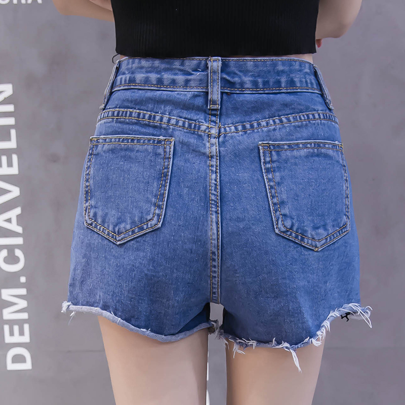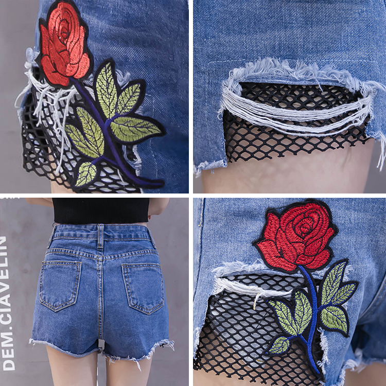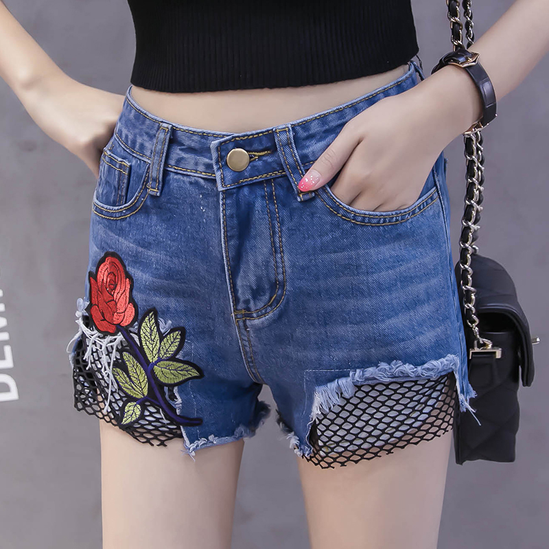 夏季韓版高腰刺繡牛仔短褲女破洞毛邊闊腿褲百搭花朵毛邊熱褲