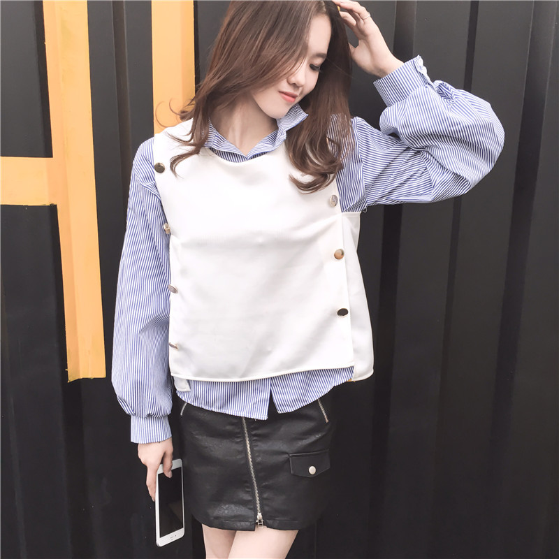 秋季套裝女時尚2017新款ulzzang襯衣韓范長袖條紋襯衫馬甲兩件套