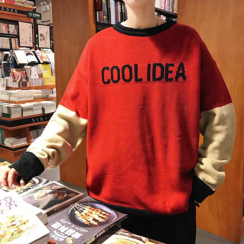 文藝男女店秋季圓領針織衫男士韓版潮流套頭秋裝寬松毛衣網紅外套