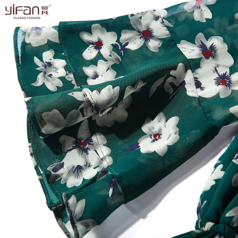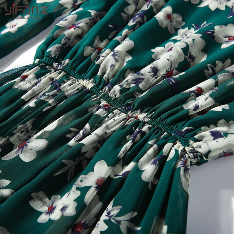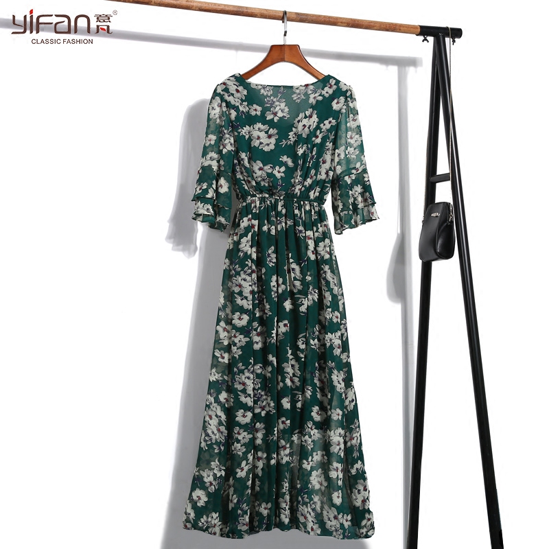 夏季新款波西米亞度假沙灘裙碎花喇叭袖V領雪紡連衣裙女長裙