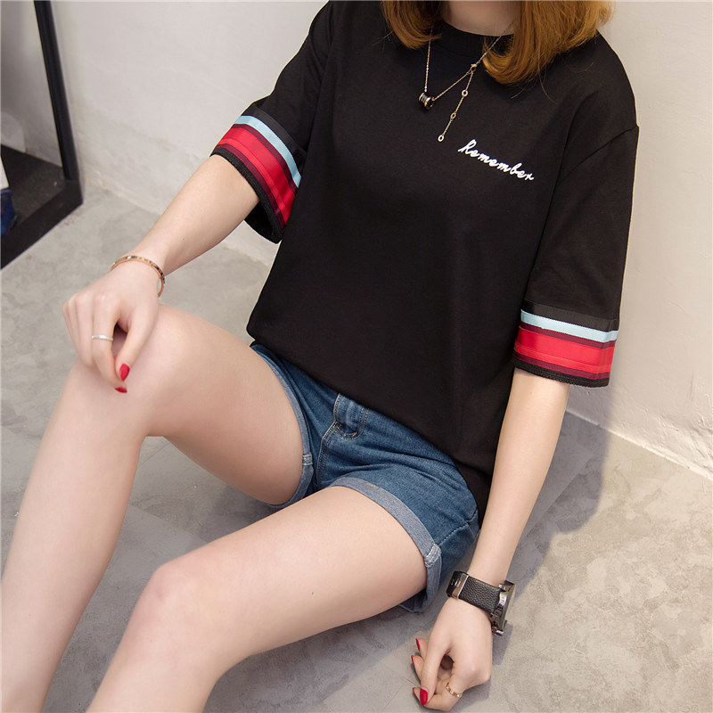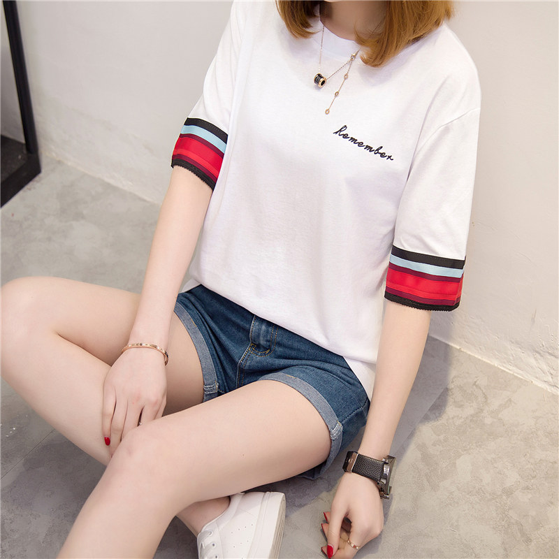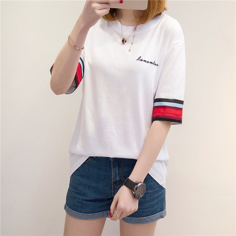 短袖上衣女夏新款條紋白色t恤女拼色短袖韓版字母打底衫百搭