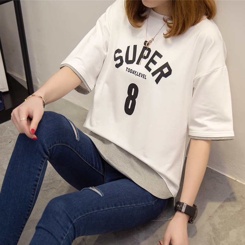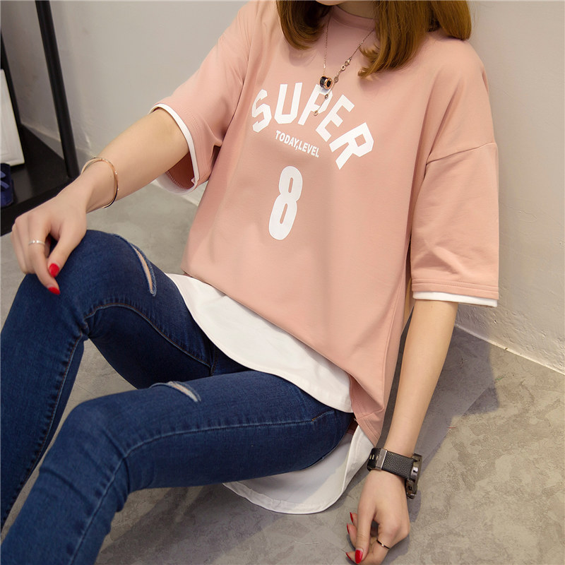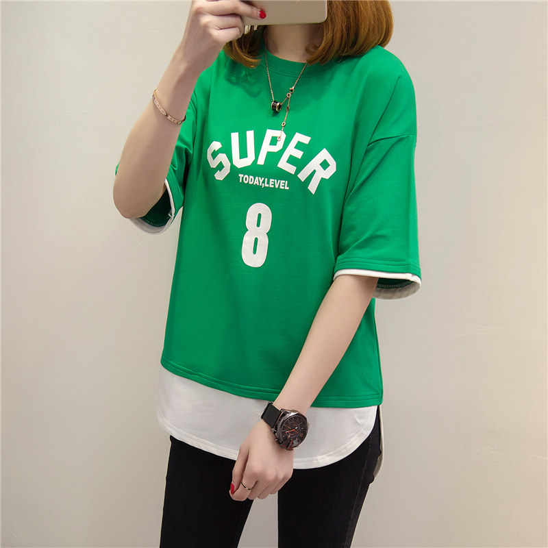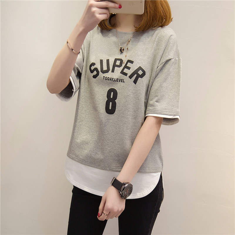 夏裝新款女裝上衣短袖t恤女套裝假兩件韓版寬松學生體恤衫女