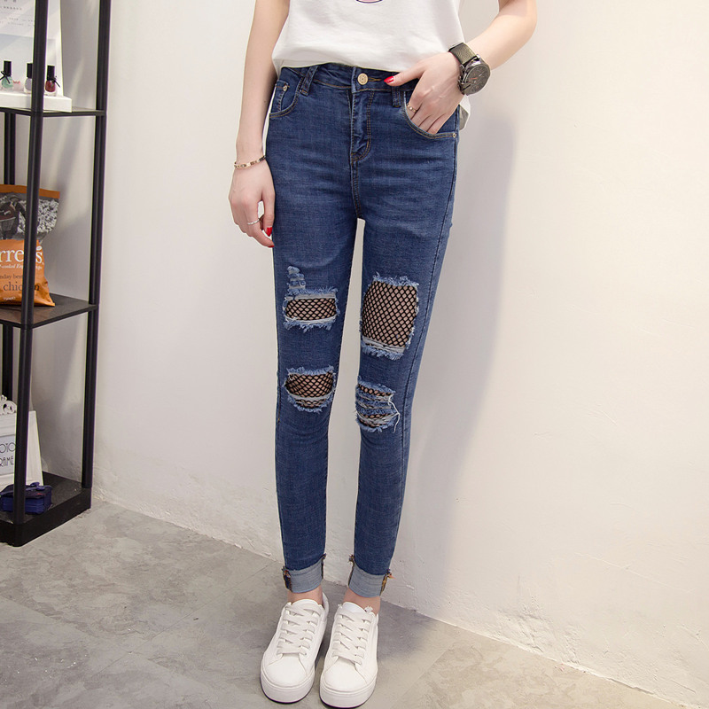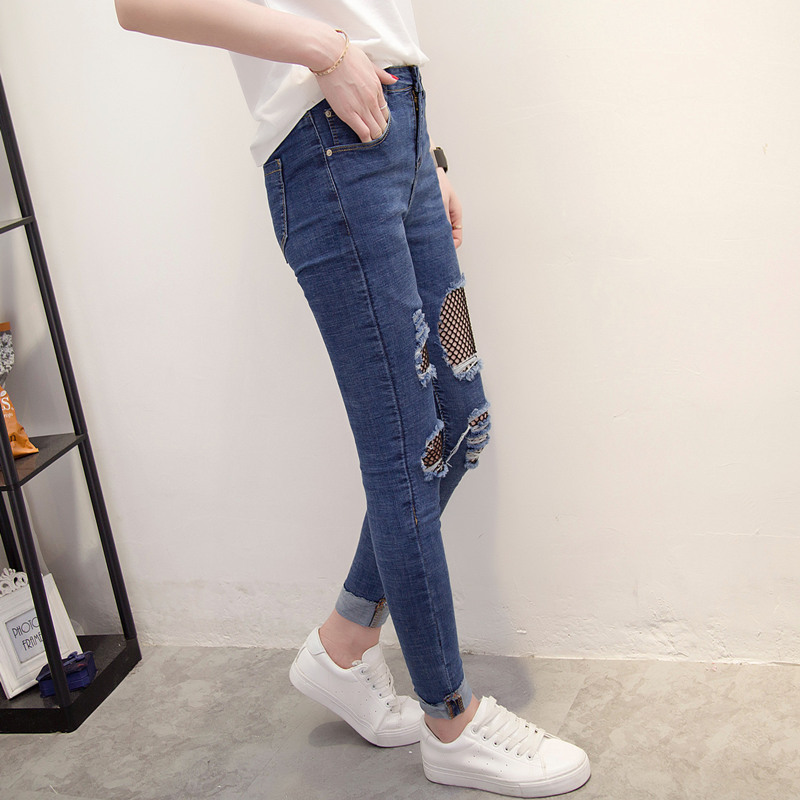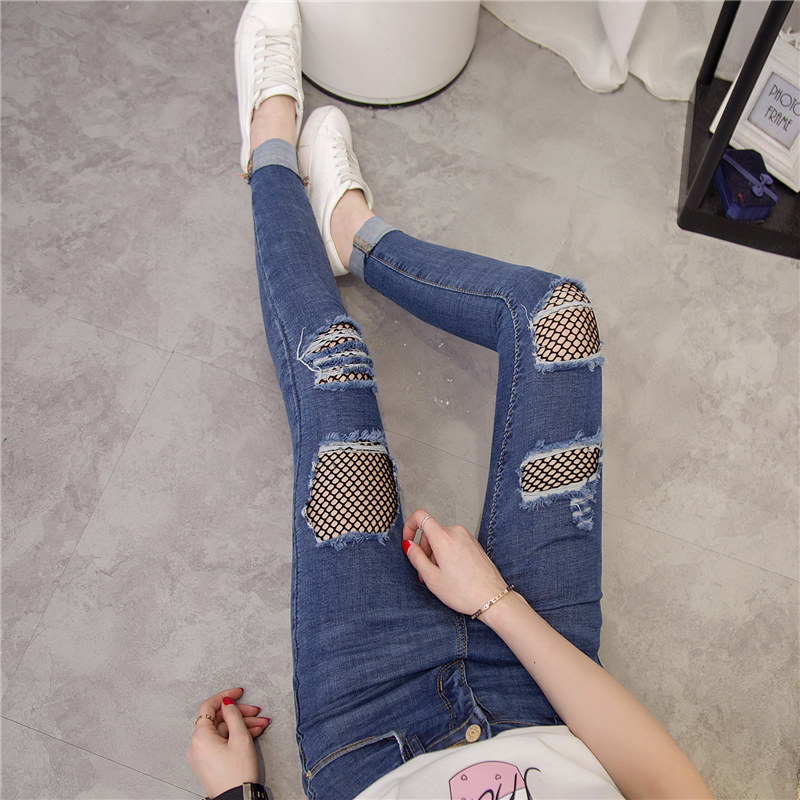 漁網破洞牛仔褲女春季女裝新款潮修身韓版顯瘦前部小腳褲長褲