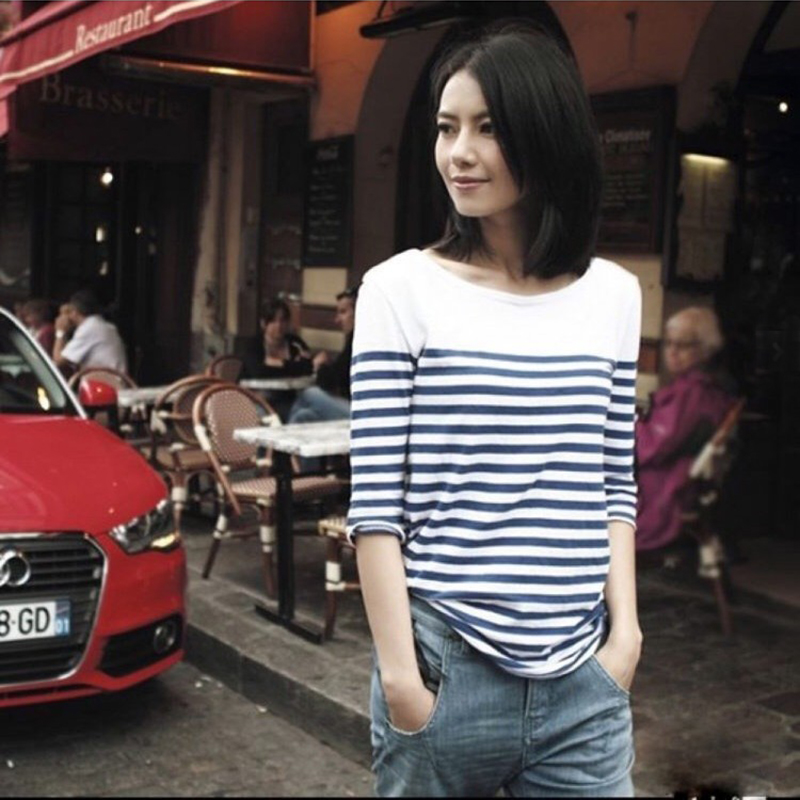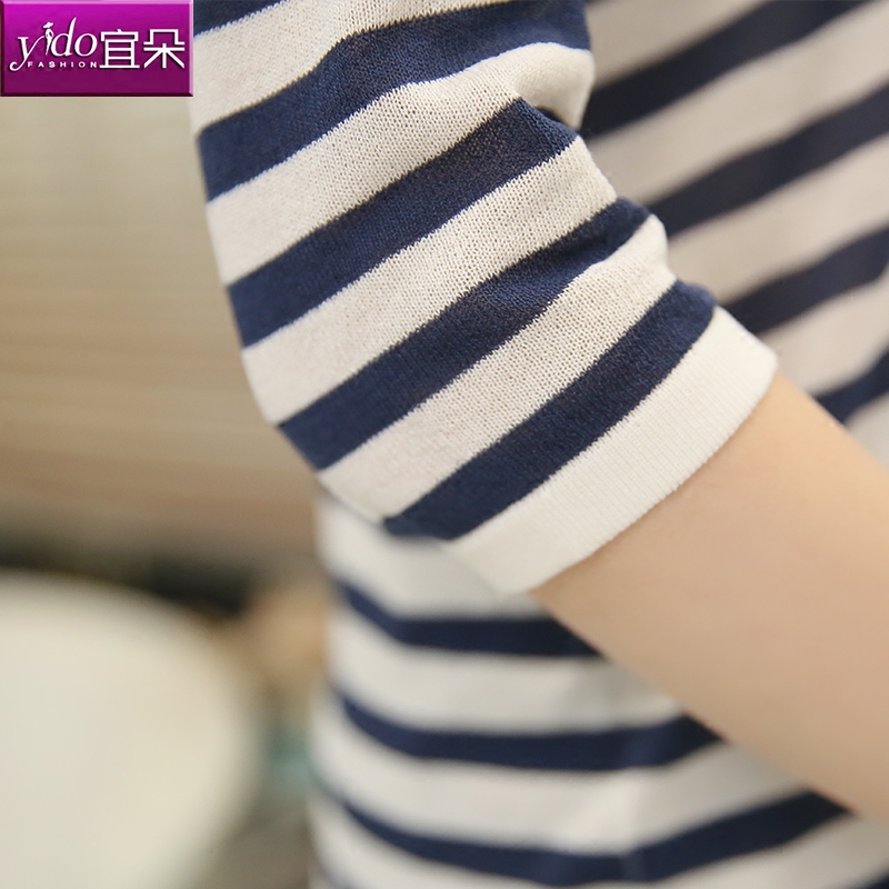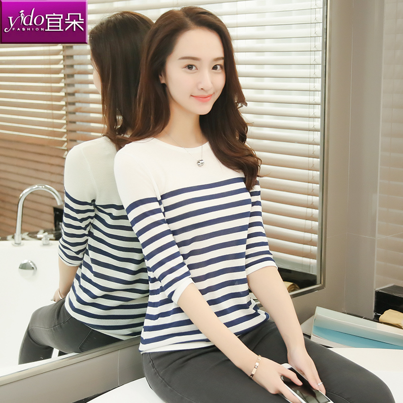 中袖條紋針織衫女短款春夏套頭打底衫外搭上衣針織衫T恤女薄