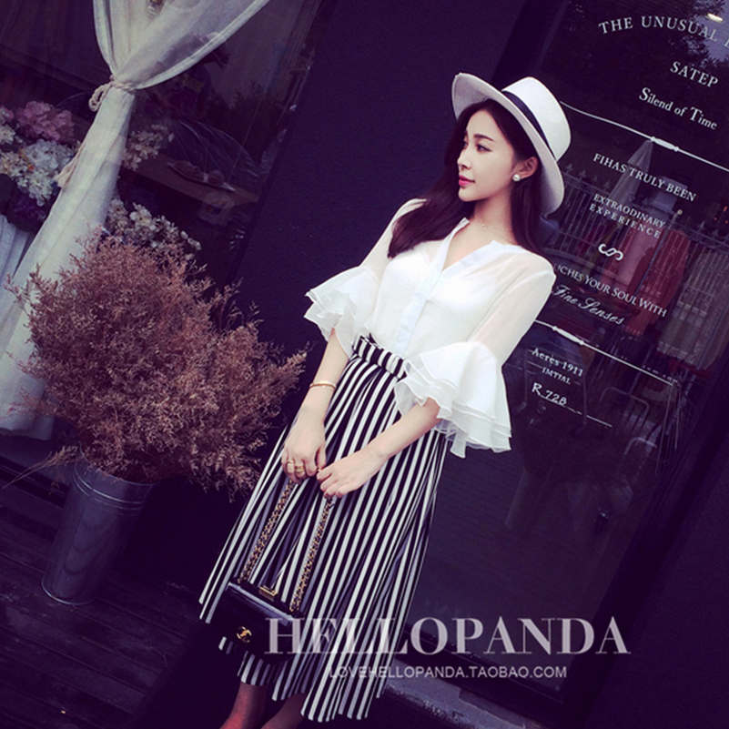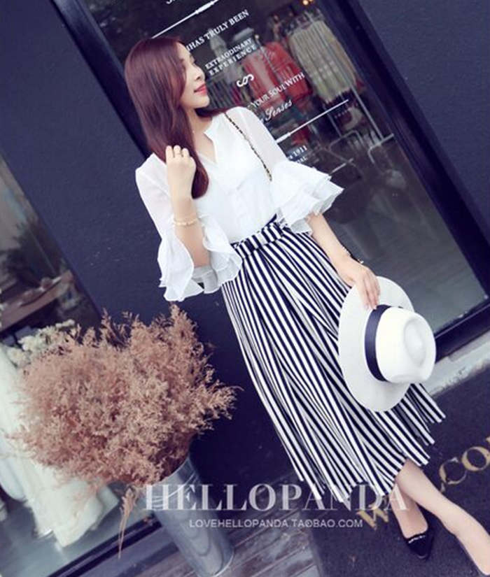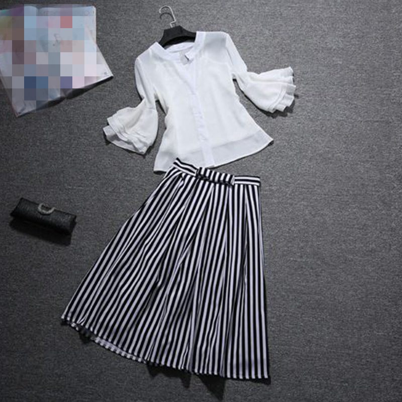 春夏季新款時尚套裝女氣質寬松雪紡襯衫條紋半身裙長裙兩件套