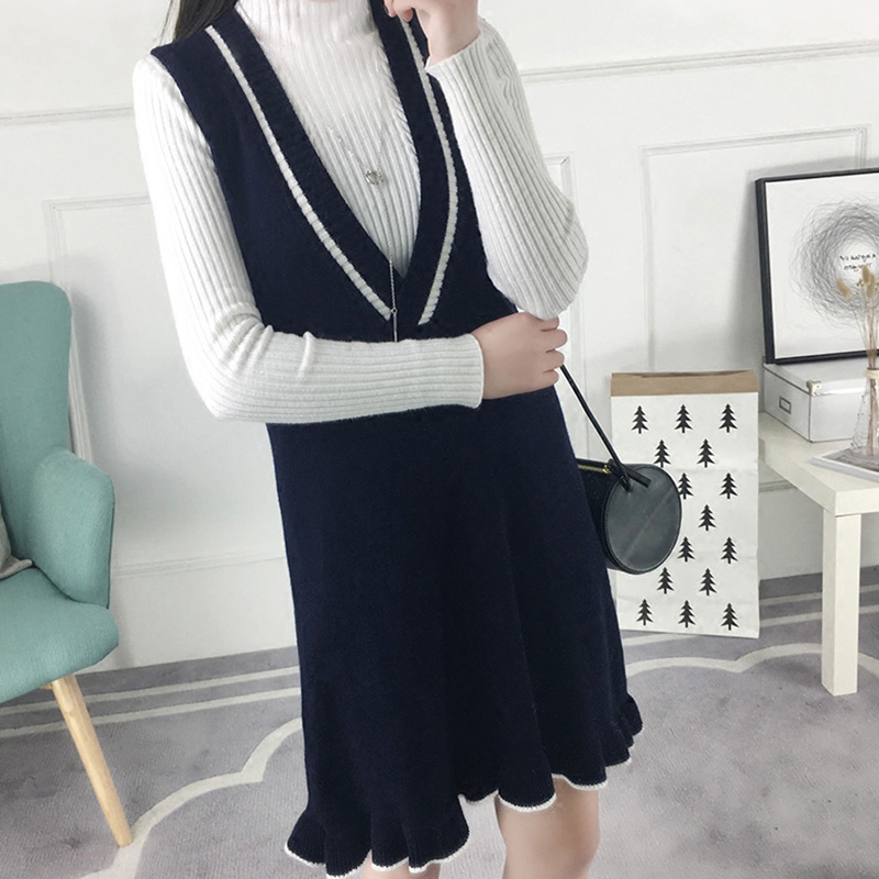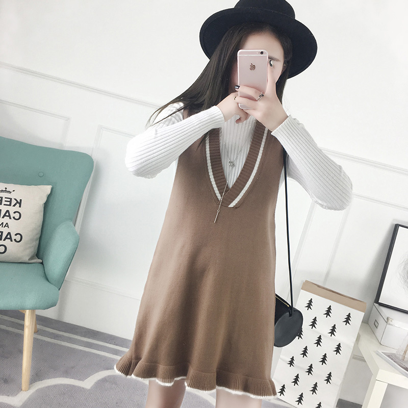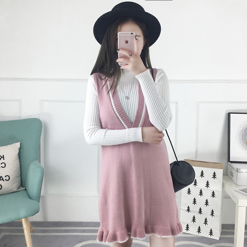 中長款韓版毛衣裙女背帶裙背心吊帶裙荷葉邊無袖寬松秋冬連衣裙潮