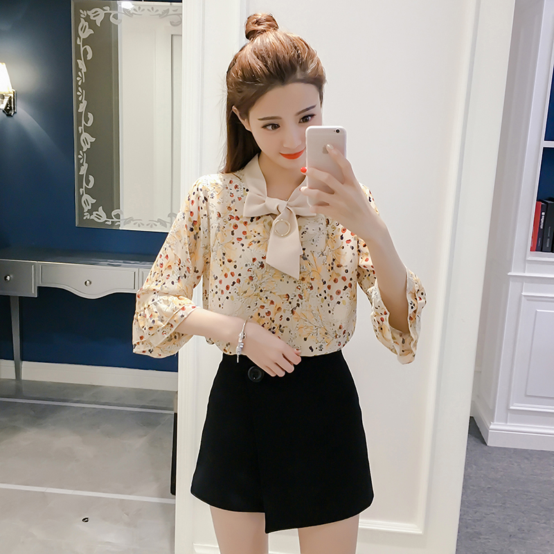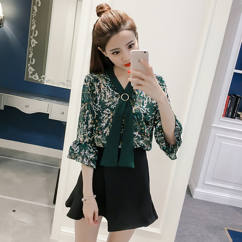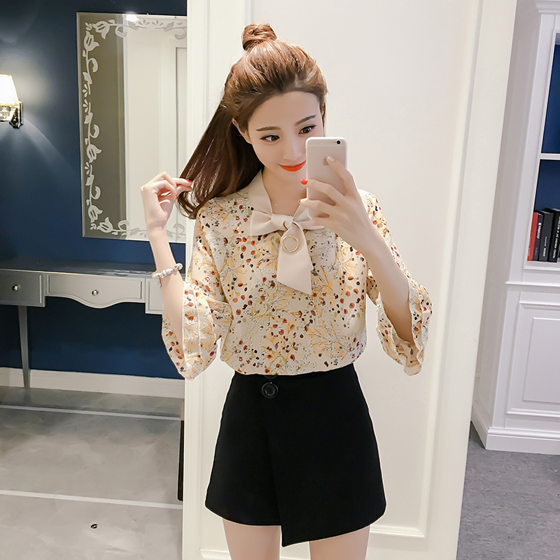 春夏新款女裝荷葉邊印花小衫顯瘦百搭七分袖碎花雪紡衫女上衣