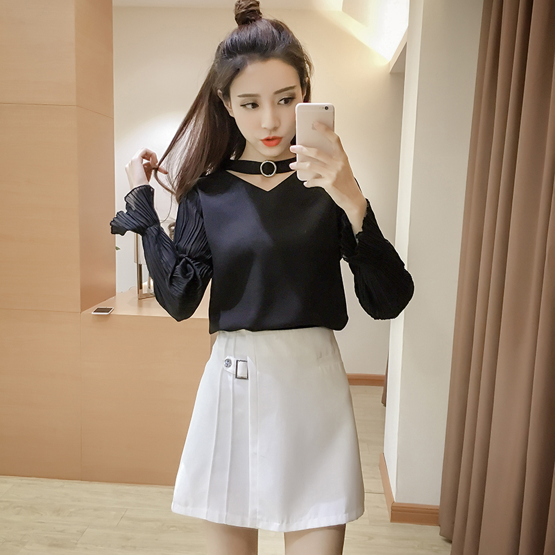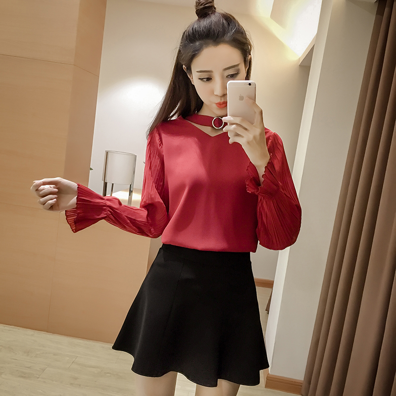 春秋裝新款韓版V領雪紡上衣女寬松顯瘦喇叭袖長袖百褶雪紡衫