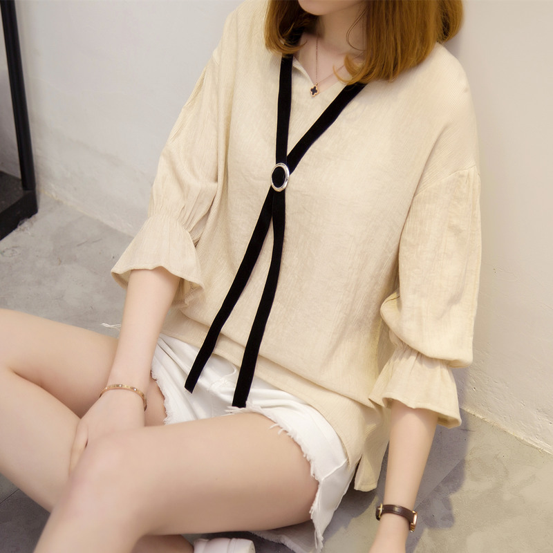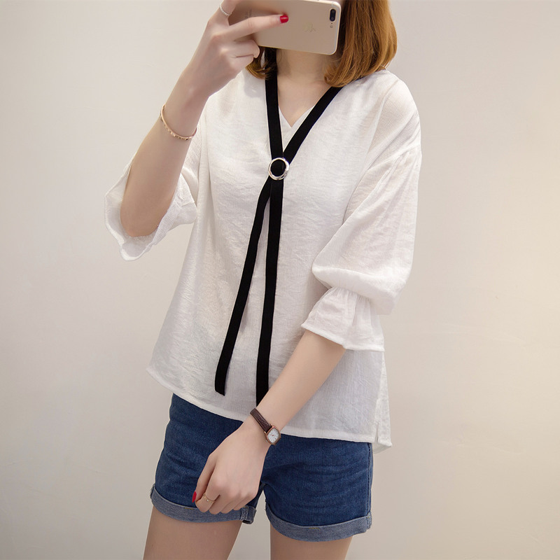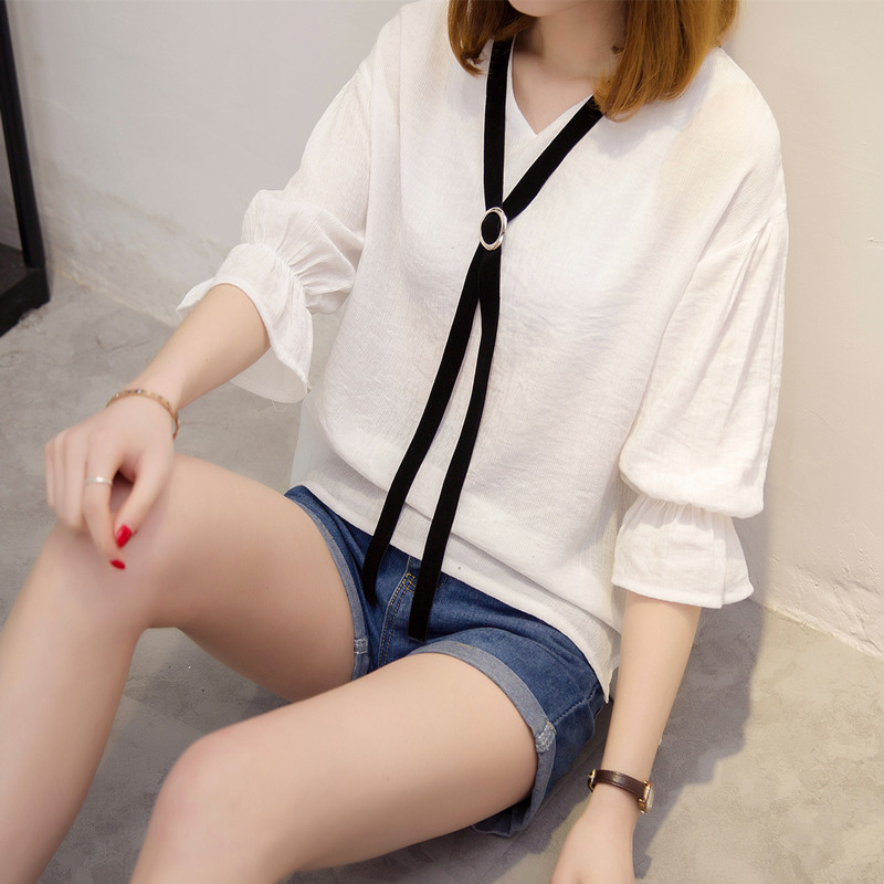 夏裝新款女裝韓版寬松荷葉袖打底體恤衫系帶春裝百搭女上衣潮