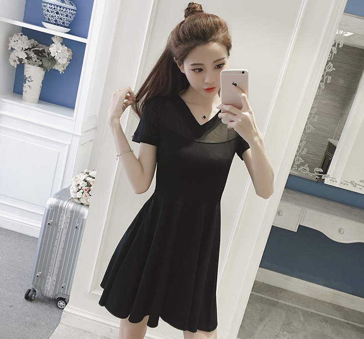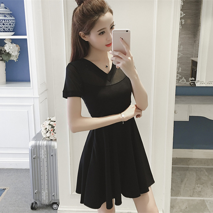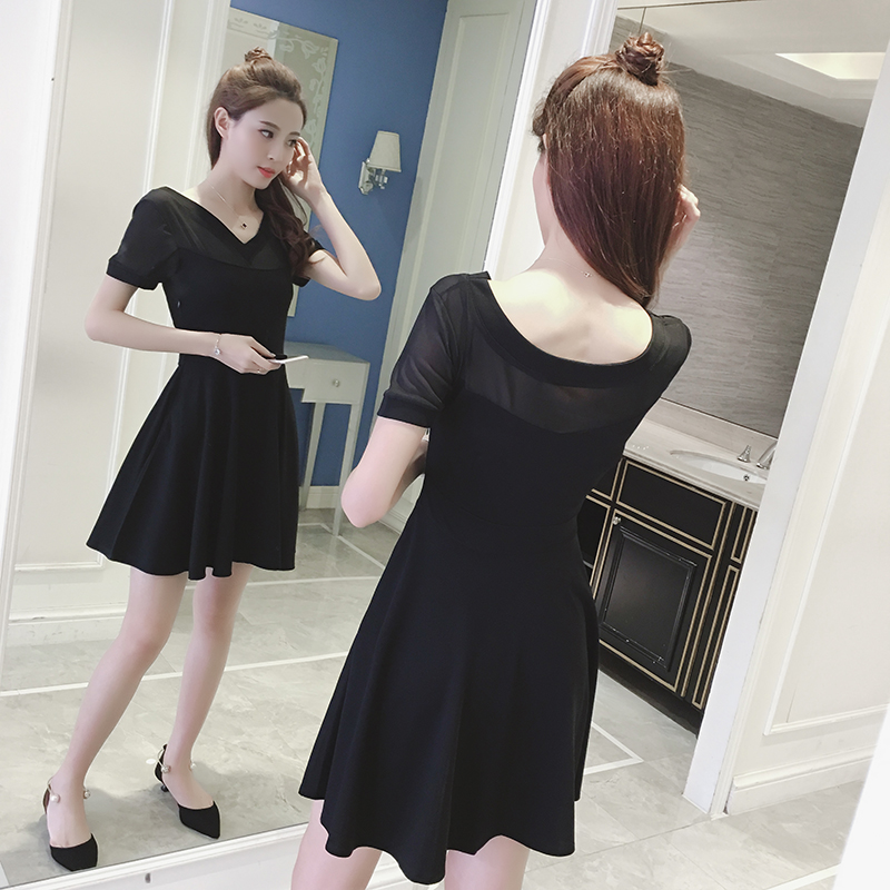 夏季新款女裝韓版網紗拼接兩穿打底小黑裙收腰顯瘦短袖連衣裙