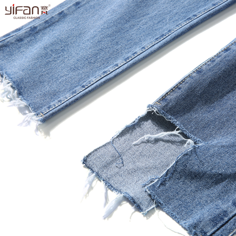 春夏韓版寬松復古直簡牛仔褲女裝純色破洞顯瘦毛邊長褲