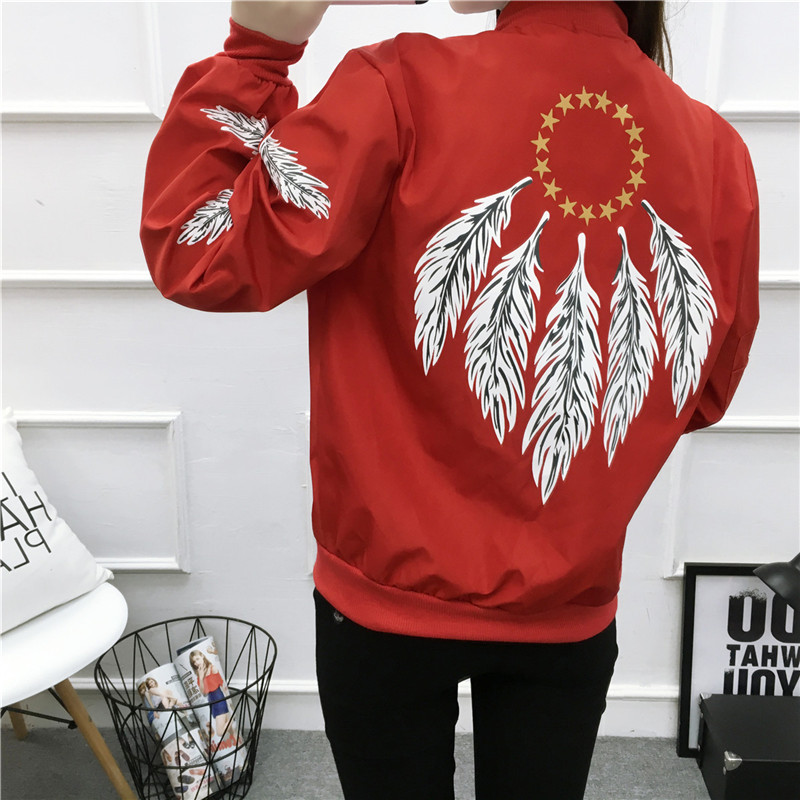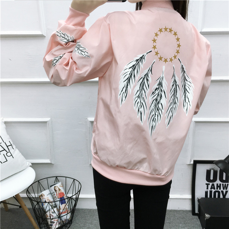 春季新品韓國原宿風飛行員羽毛印花情侶棒球服寬松百搭夾克外套女