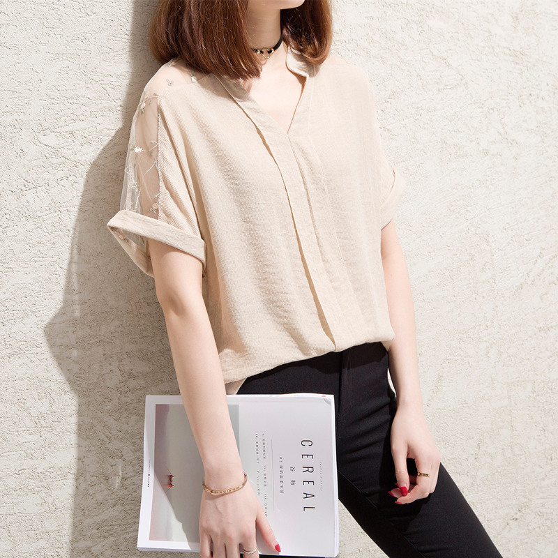 白色t恤女小清新露肩上衣bf風V領網紗寬松體恤短袖女夏裝新款